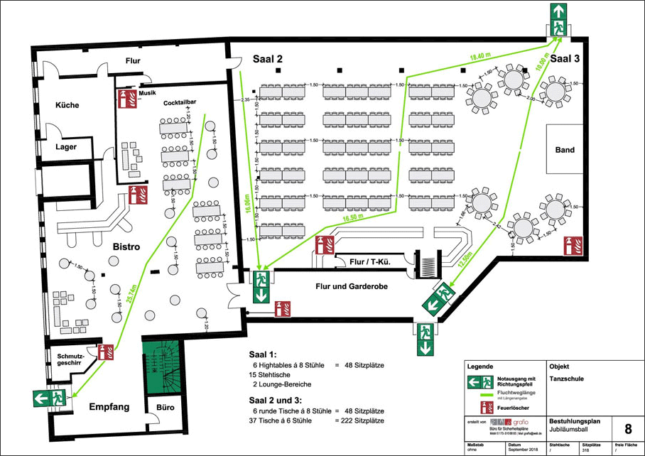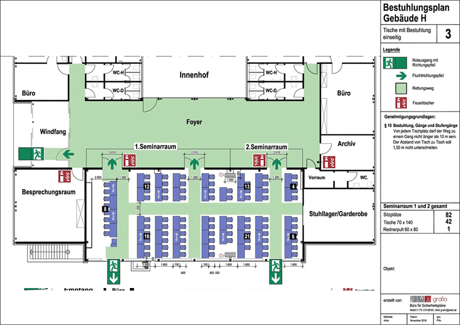 Für größere Versammlungsstätten sind Bestuhlungspläne verpflichtend. Dabei werden u.a. auch Plätze für Rollstuhlbenutzer, die max. genehmigte Anzahl der Besucher sowie die Anzahl und Breite der Notausgänge und den Verlauf der Rettungswege berücksichtigt.