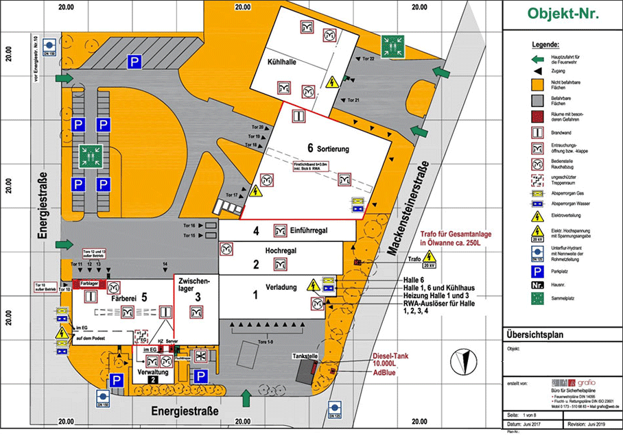 Feuerwehrpläne enthalten für die Feuerwehr im Ernstfall wichtige Angaben über Nutzung, Gebäudegrößen und -abstände zueinander, Brandabschnitte, Treppenräume, Rettungswege, Lagerung gefährlicher Stoffe, sowie Hinweise auf Löschmittel und Löschwasserrückhaltung. Ein Plansatz besteht aus dem Übersichtsplan, den Geschossplänen und dem Textteil der Anlage B.